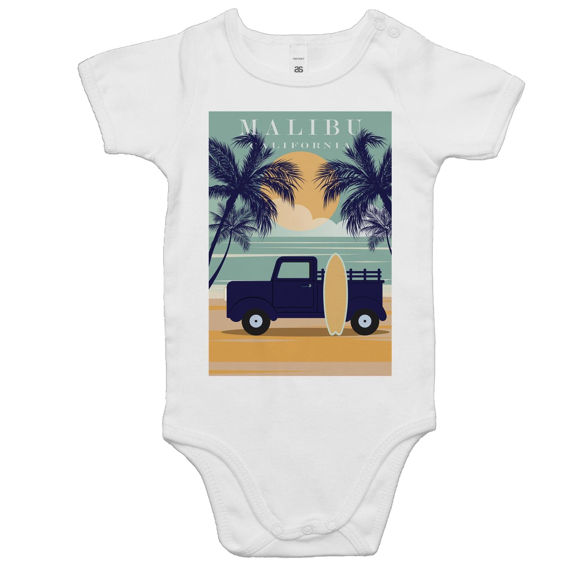 Shop Malibu California - Baby Onesie Romper by Arty Threads and update your baby's wardrobe with a super comfy, high quality onesie romper from our awesome arty baby onesie collection. This arty baby romper is made to order and shipped from Australia. Available in 5 sizes: 0-3m, 3-6m, 6-12m, 12-18m, and 18-24m.