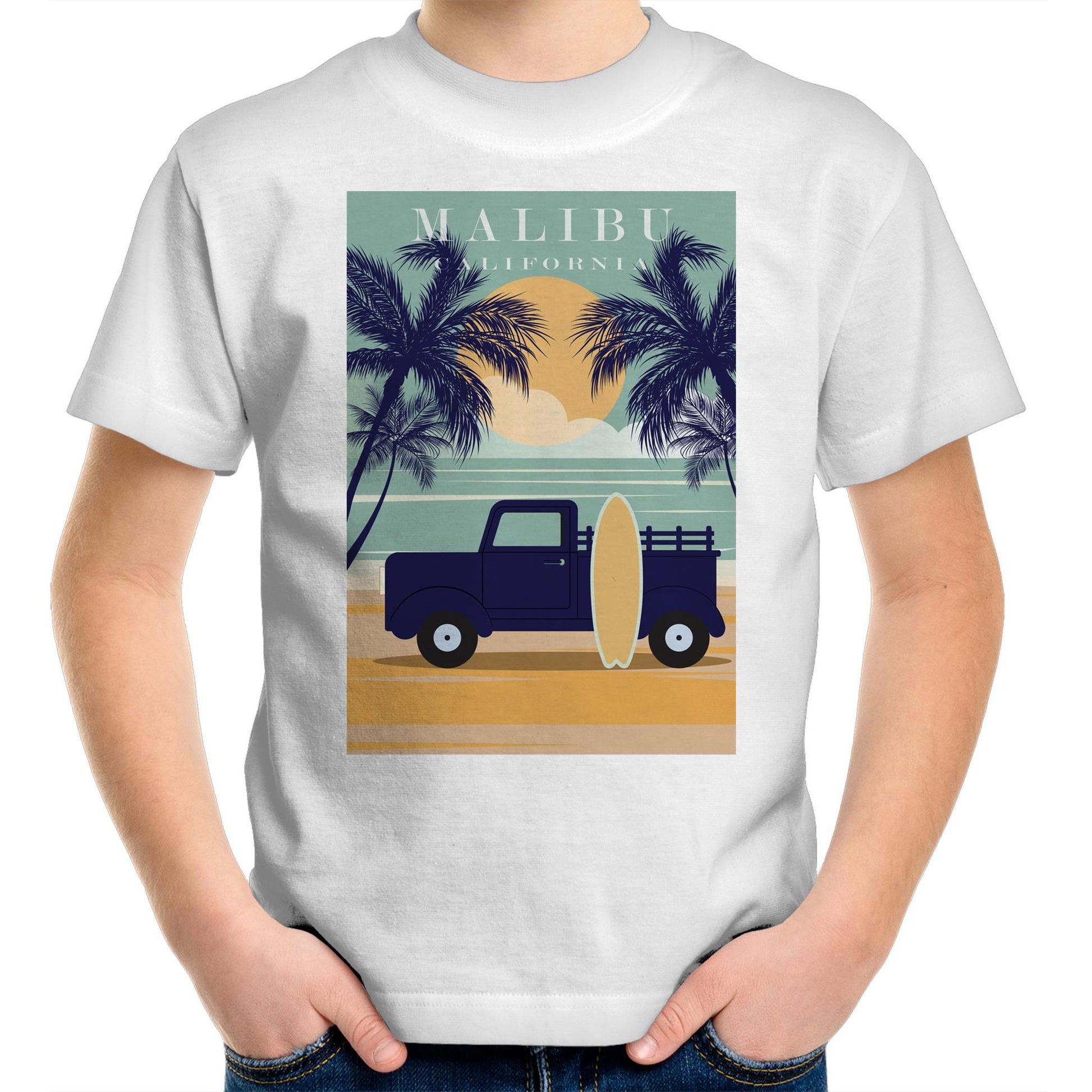 Shop Malibu California - Kids T-Shirt by Arty Threads and update your child's wardrobe with a super comfy, high quality tee from our awesome graphic tee collection. This arty tee is made to order and shipped from Australia.